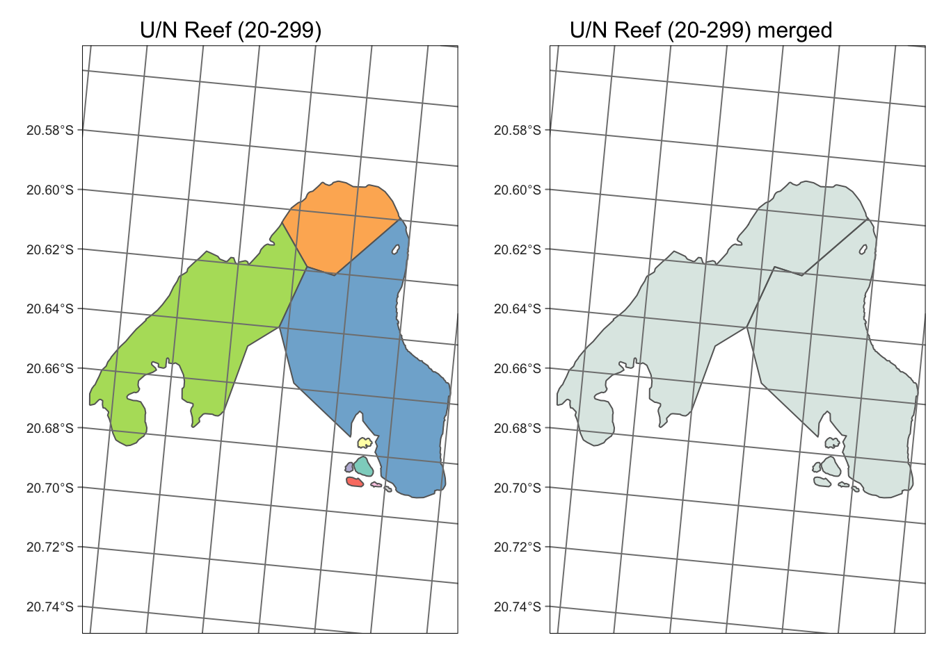 tm_layout(main.title="U/N Reef (20-299) merged", main.title.position = "center", main.title.size = 1) +
