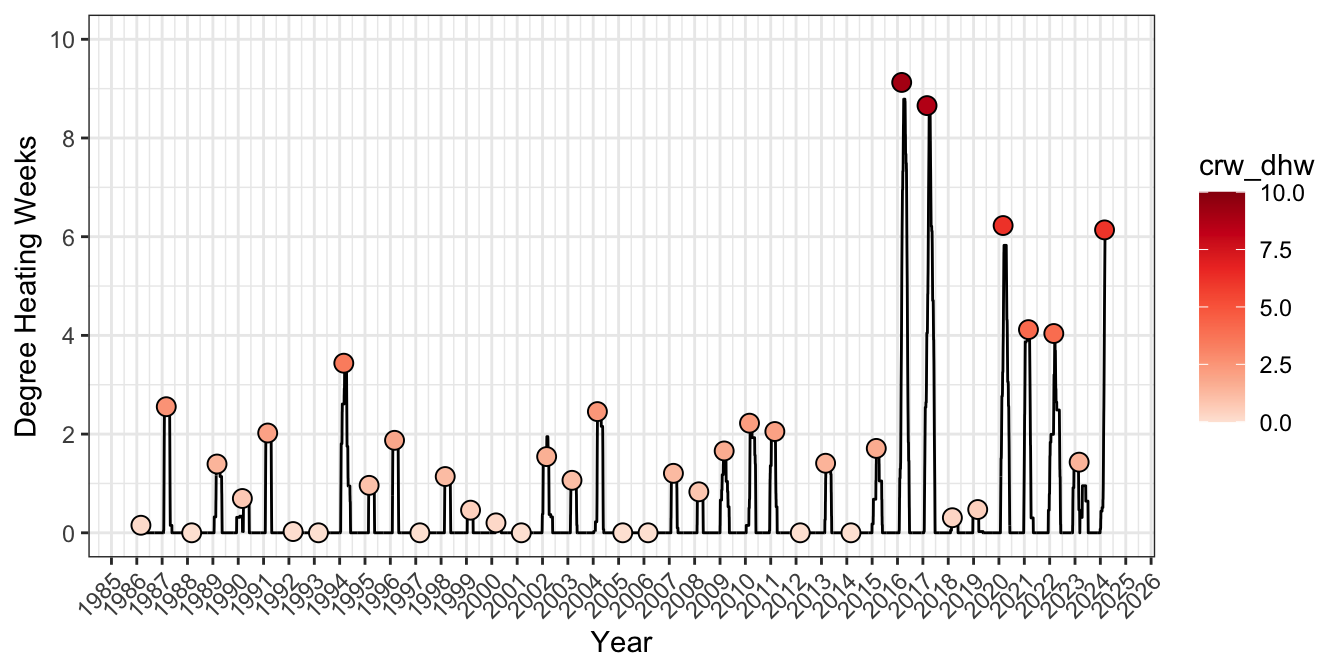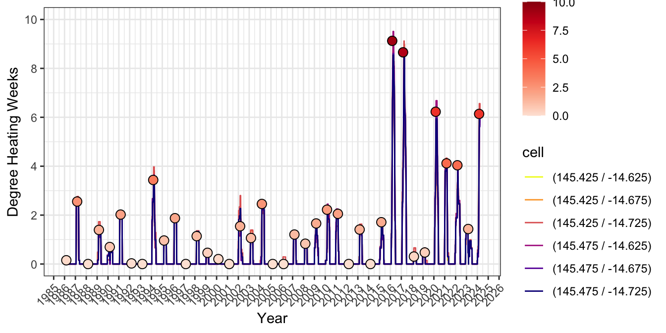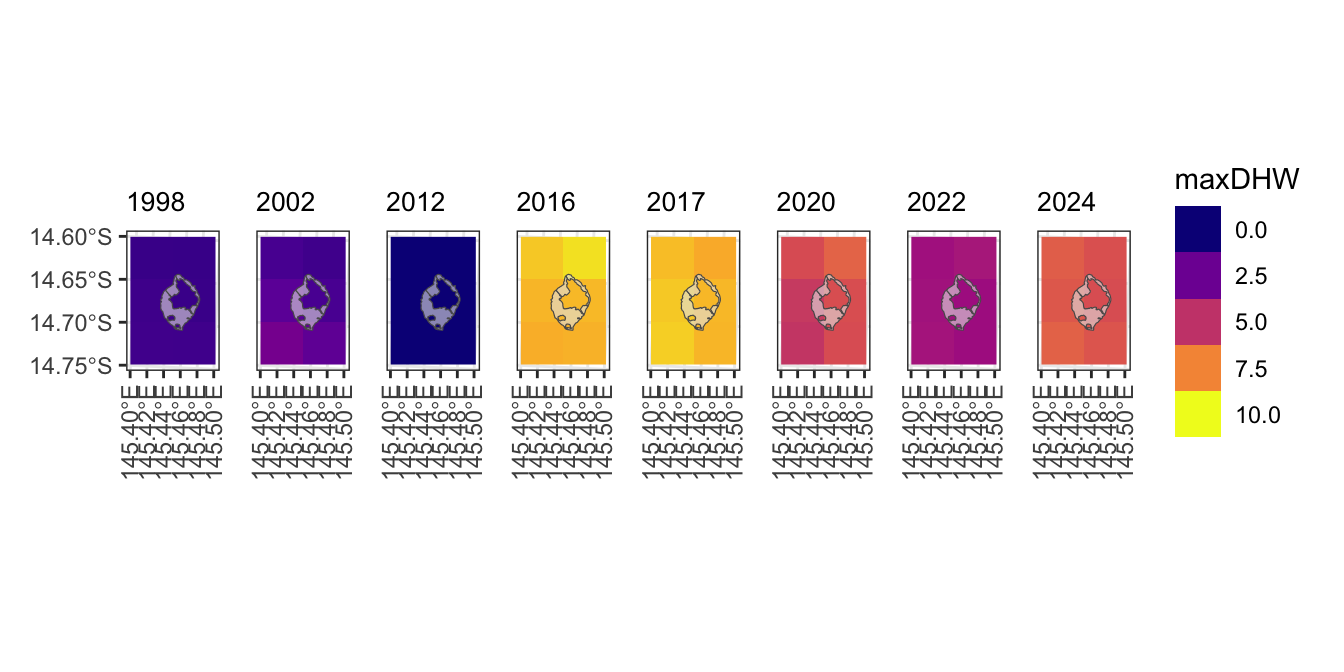 For each gridcell, the maximum DHW value per year (“yearly maximum DHW”, Van Hooidonk & Huber 2009) was extracted for each year (1986:2024). DHW for 2024 were extracted separately due to an incomplete timeseries at the time of analysis. The approaches to calculating DHW on the GBR differ among studies, for example:
