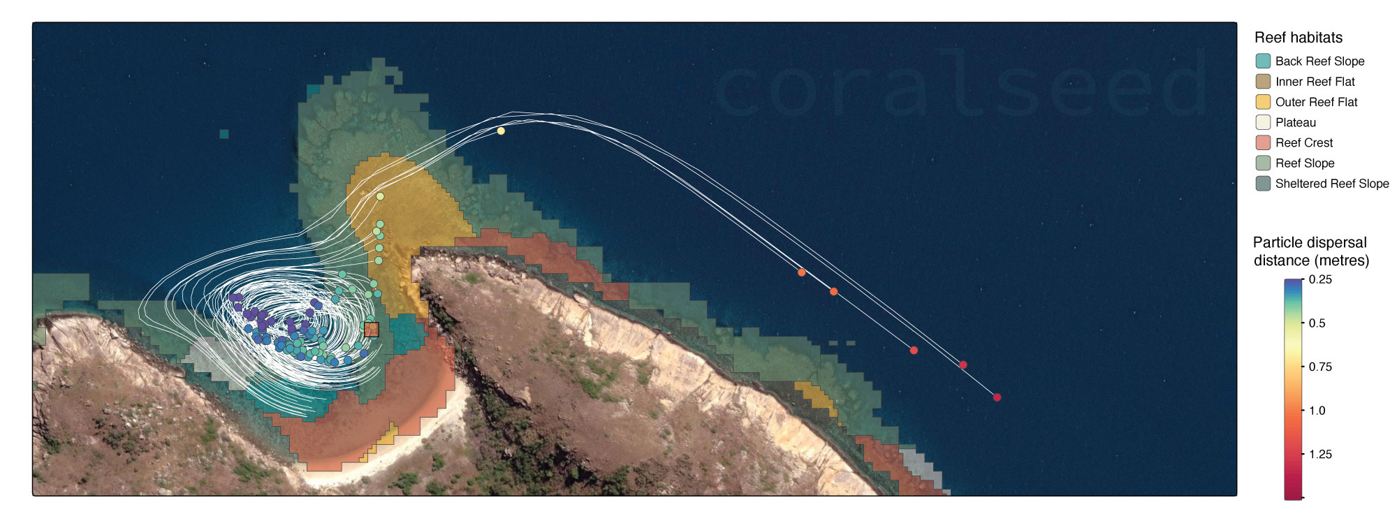 coralseed is a spatially explicit probabilistic model aims to quantify the spatial footprint of coral larval re-seeding from restoration progjects. The model is based on input from high-resolution oceanographic models (CONNIE) that tracking individual particles through space and time. By parameterising larval behaviour (competency, habitat specific substrate settlement preferences, swimming behaviour) individual-based probability of settlement can be modelled for 105 - 107 larvae. Individual-based settlement probability an dispersal paths then overlaid onto high-resolution habitat maps (Allen Coral Atlas) to form a spatially-explicit model of settlement following release of coral larvae.