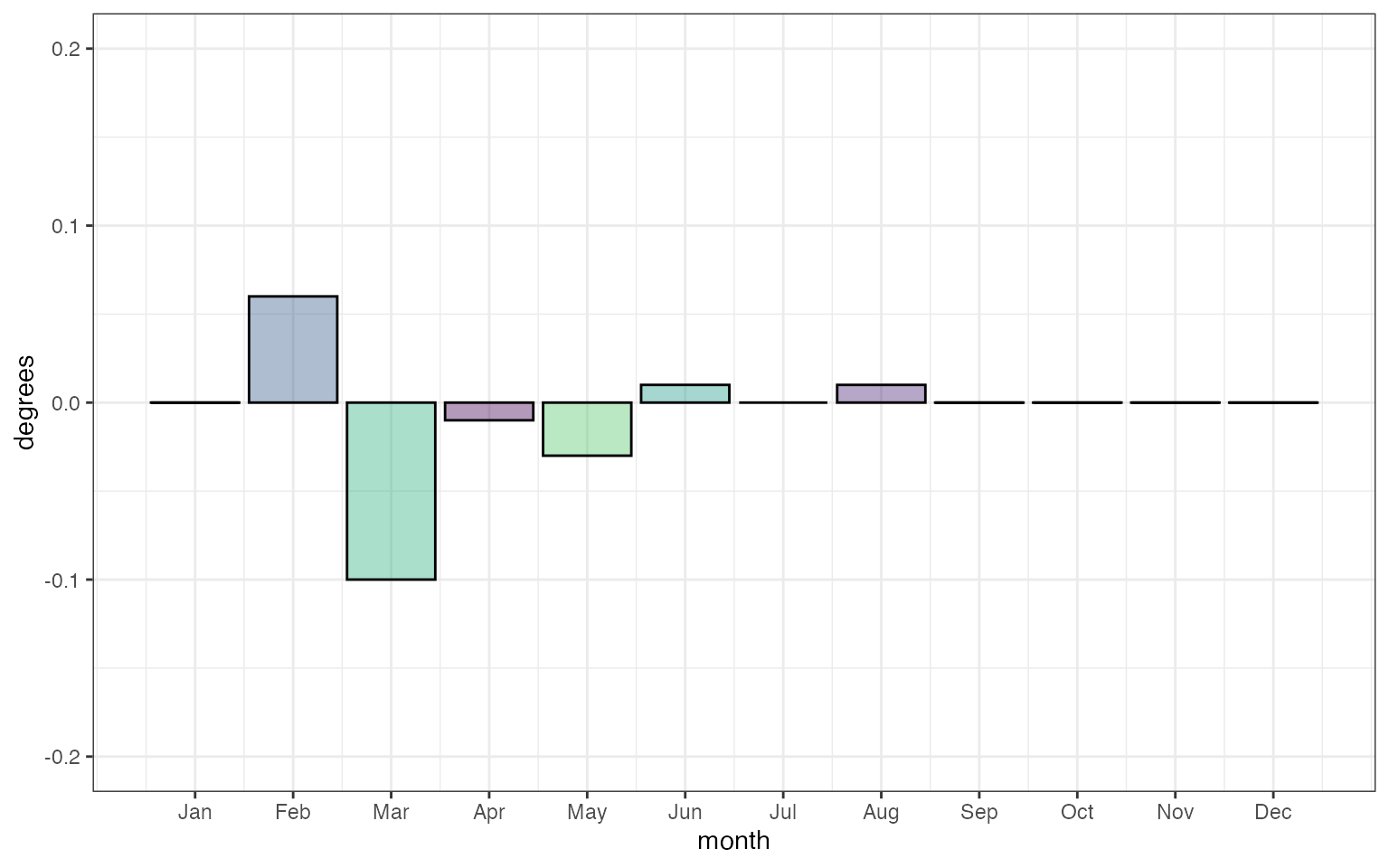 geom_col((aes(x = month.num, y = difference, fill = month)), show.legend=FALSE, alpha = 0.4, color="black") +