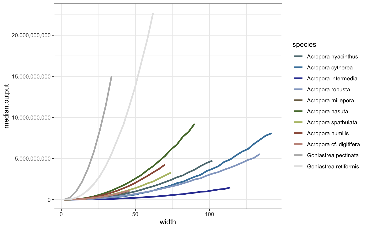 geom_line(data=summary_dt, aes(width, median.output, color=species), linewidth=1.2) +
