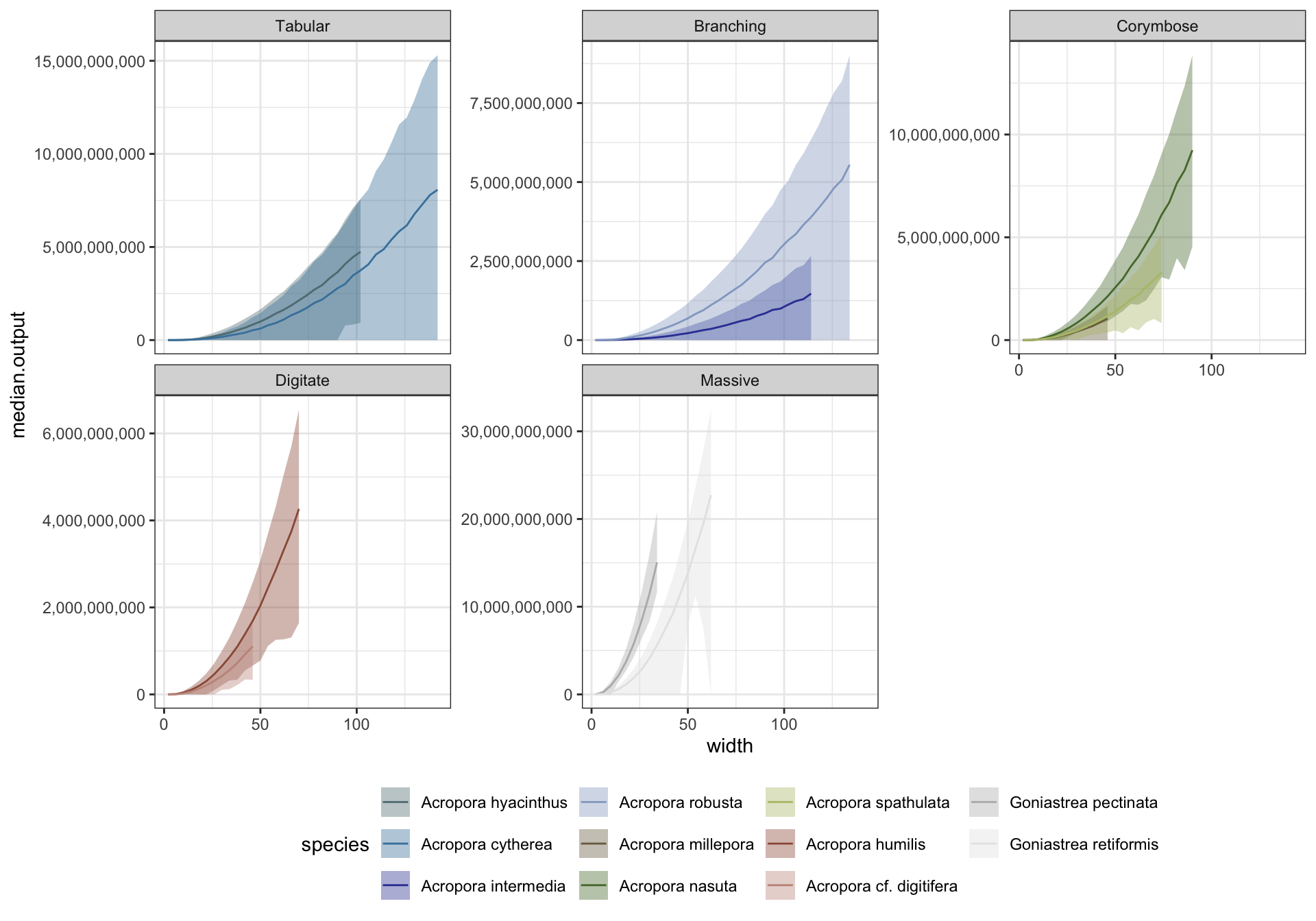 geom_ribbon(data = summary_dt, aes(width, ymin = lower.ci.output, ymax = upper.ci.output, fill = species), alpha = 0.4) +