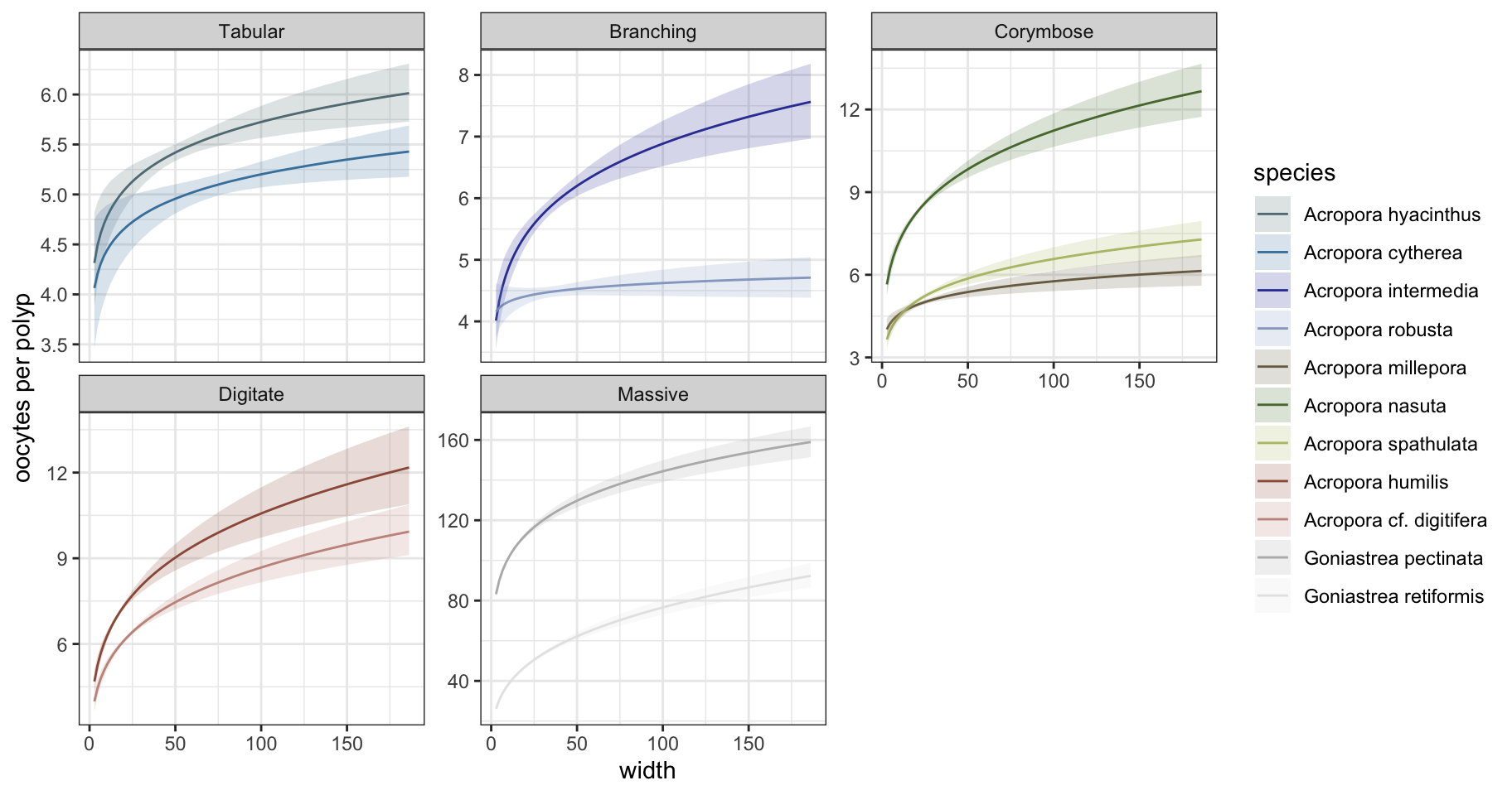 geom_ribbon(data=brm_fecundity_plots, aes(width, ymin=lower__, ymax=upper__, fill=species), alpha=0.2, show.legend=TRUE) +