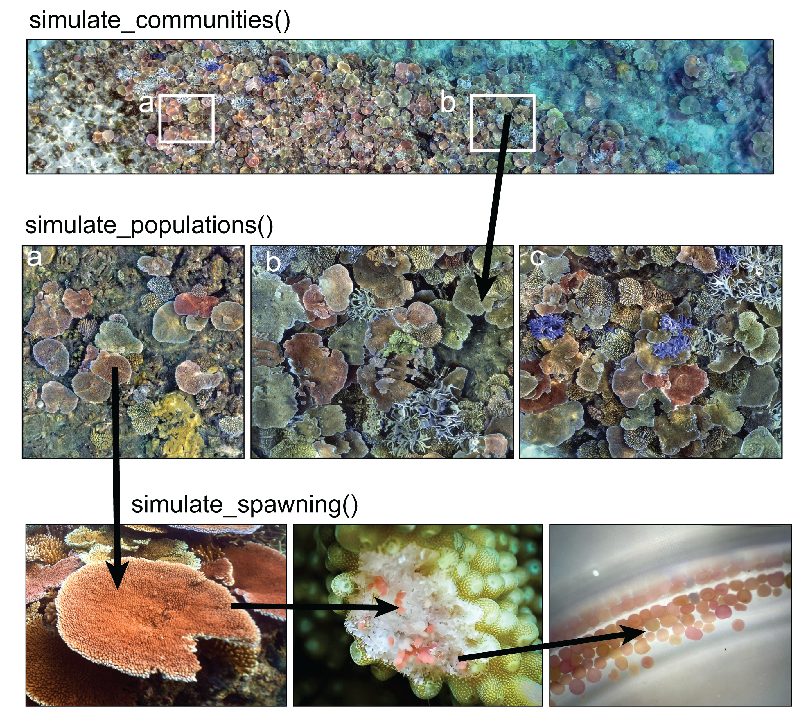 simulate_spawning takes the colonies from populations and parameterises a per colony output of oocytes based on Bayesian models fit to data from Lizard Island (Álvarez-Noriega et al 2016). The function uses posterior_predict from the brms models to sample draws from the posterior predictive distribution of the observed data (i.e. adds model uncertainty + residual (observation-level) noise). For each colony, the function predicts the total number of polyps, proportion of the polyps that are reproductive (i.e. not within the sterile zone at growth margins), the number of oocytes per polyp, and the probability of colonies being reproductive (binomial).