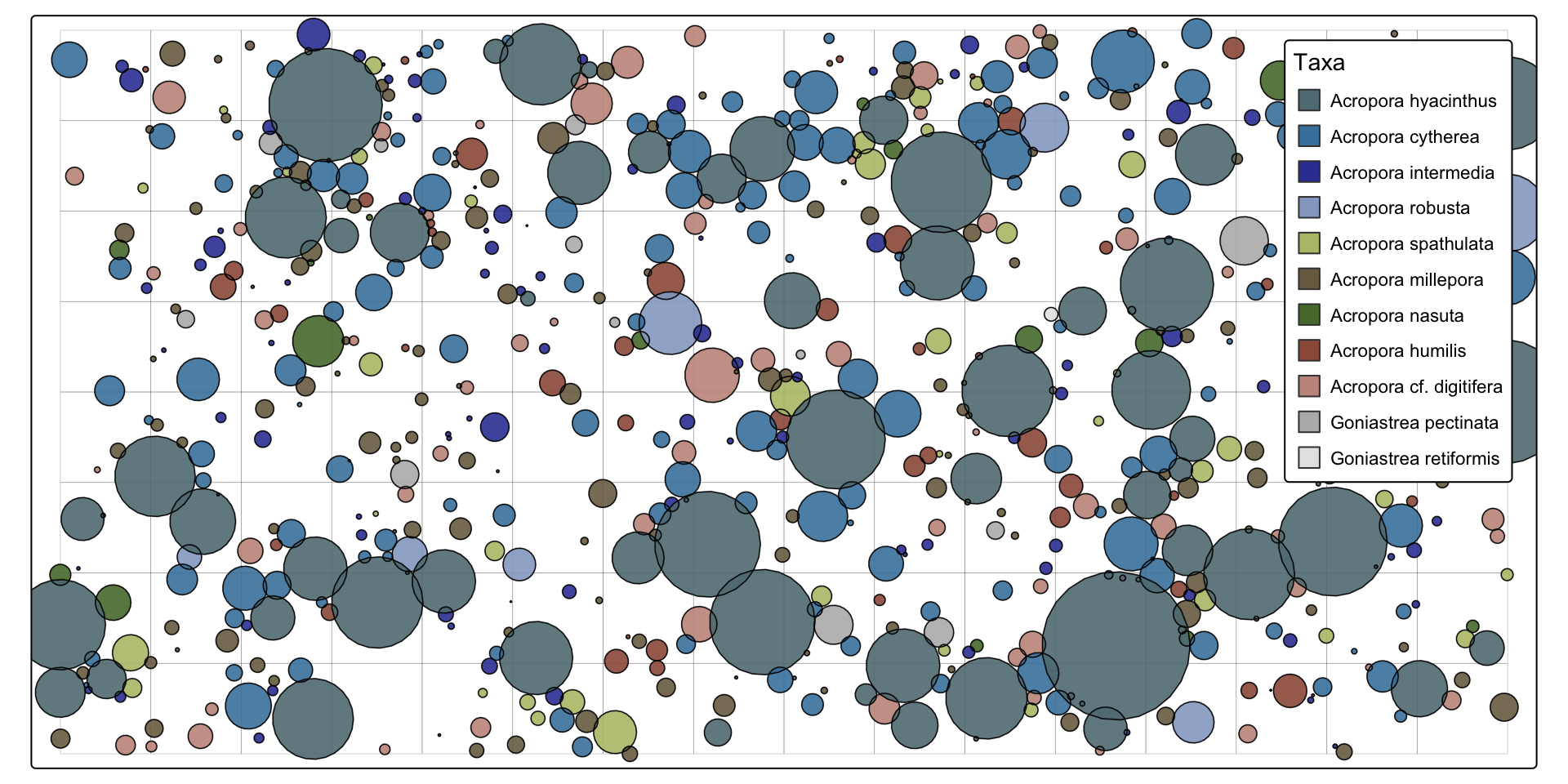 Simulate coral communities at 40% cover within the 128 [m^2] plot. Communities are structured from 11 species across five different growthforms: tabular corals (Acropora cytherea, A. hyacinthus), corymbose corals (A. millepora, A. nasuta, A. spathulata), digitate corals (A. humilis, A. digitifera), branching corals (A. intermedia, A. robusta), and massive corals (Goniastrea pectinata, G. retiformis).